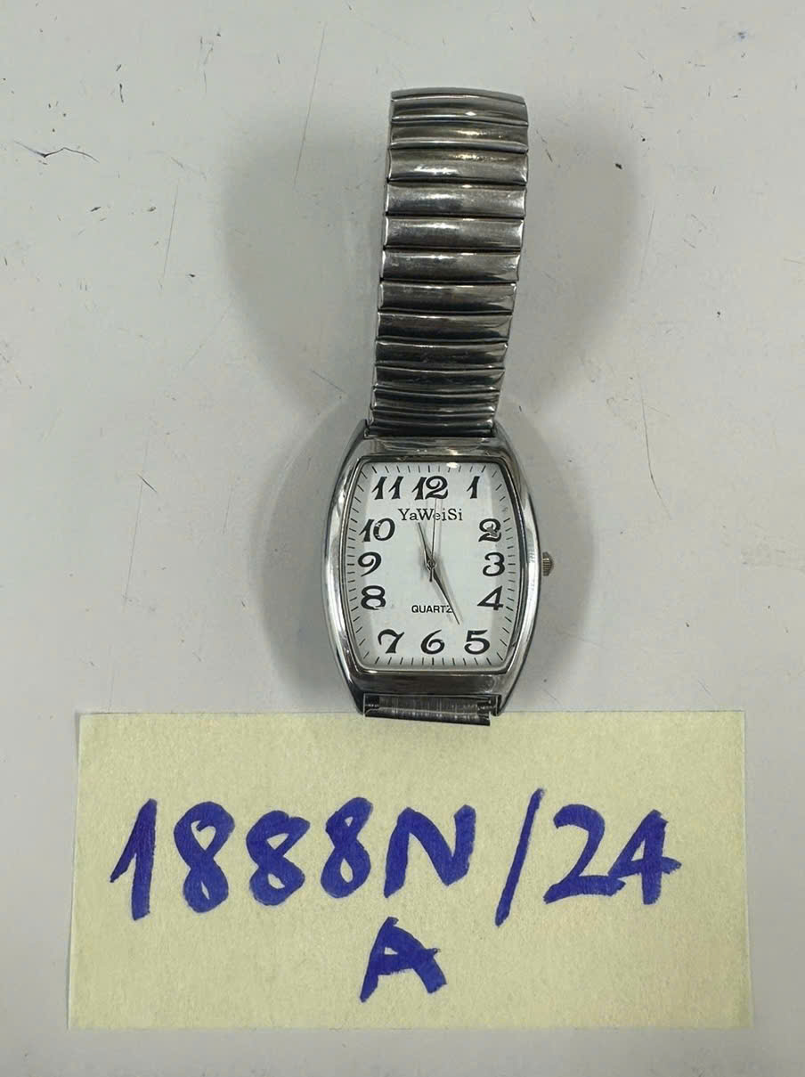 Ngày tiếp nhận: 05/11/2024 Mã hồ sơ: 1888N2024A Mô tả: 01 đồng hồ dây kim loại mặt tròn màu trắng hiệu YAWEISI. |