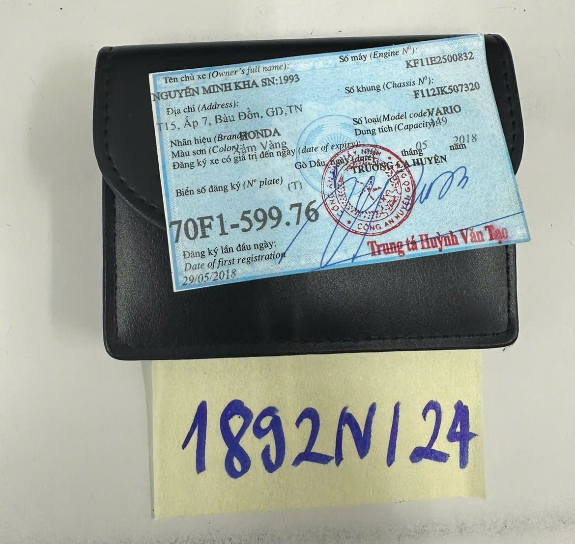 Ngày tiếp nhận: 05/11/2024 Mã hồ sơ: 1892N2024 Mô tả: 01 ví màu đen có 704.000VND, 01 GPLX tên Nguyễn Minh Kha, 02 thẻ NH tên Nguyễn Thị A Tiên. |