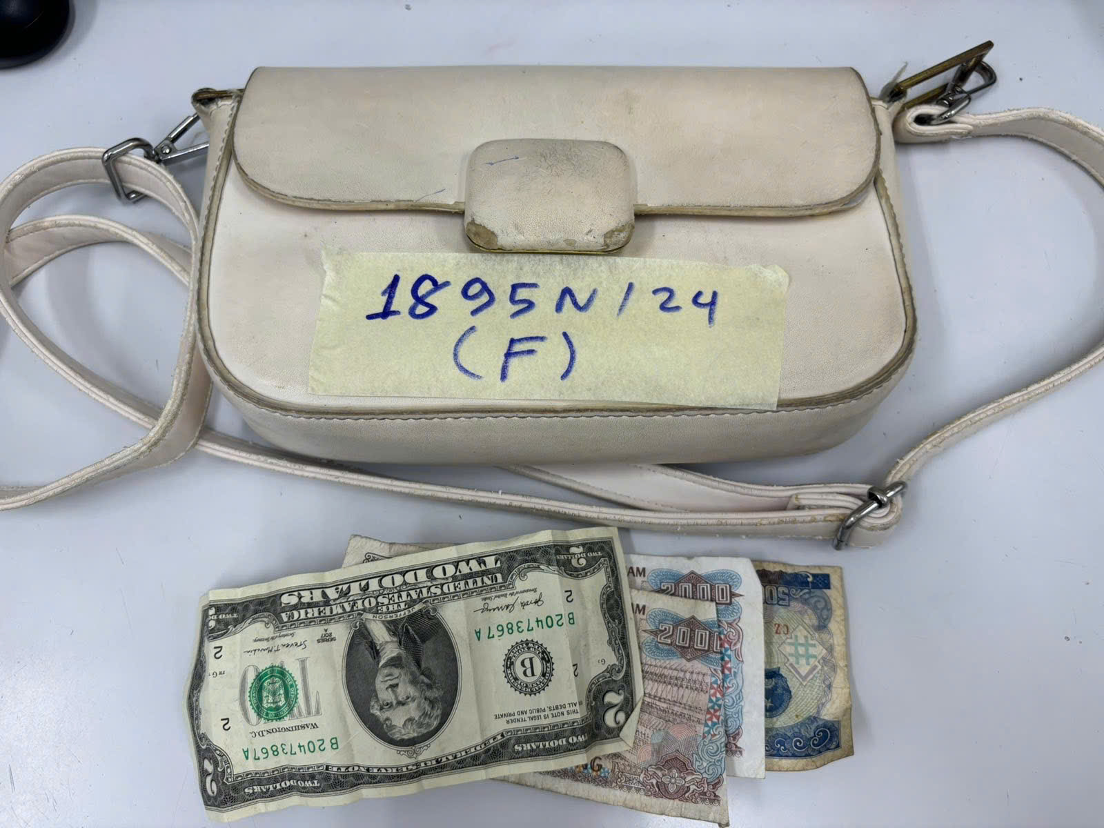 Ngày tiếp nhận: 05/11/2024 Mã hồ sơ: 1895N2024F Mô tả: 01 túi da màu trắng, bên trong có vật dụng cá nhân và 01 tờ mệnh giá 2 USD, 9000VND. |