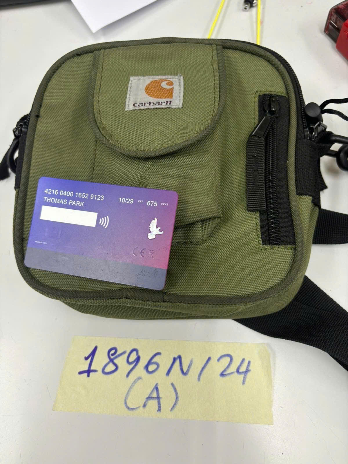 Ngày tiếp nhận: 06/11/2024 Mã hồ sơ: 1896N2024A Mô tả: 01 túi đeo bằng vải màu xanh có 01 sạc dự phòng, 01 thẻ NH tên Thomas Park. |