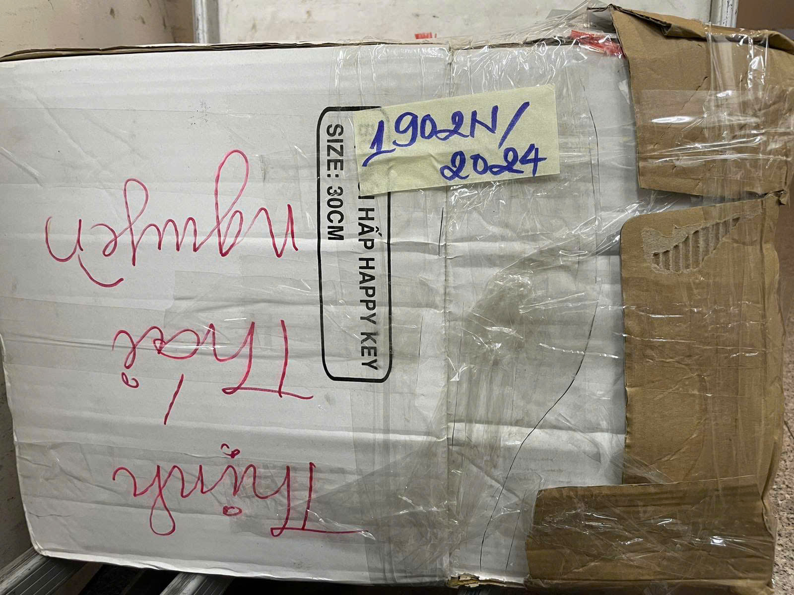 Ngày tiếp nhận: 06/11/2024 Mã hồ sơ: 1902N2024 Mô tả: 01 thùng giấy bên trong có quần áo, giày, túi (tất cả đều qua sử dụng). |