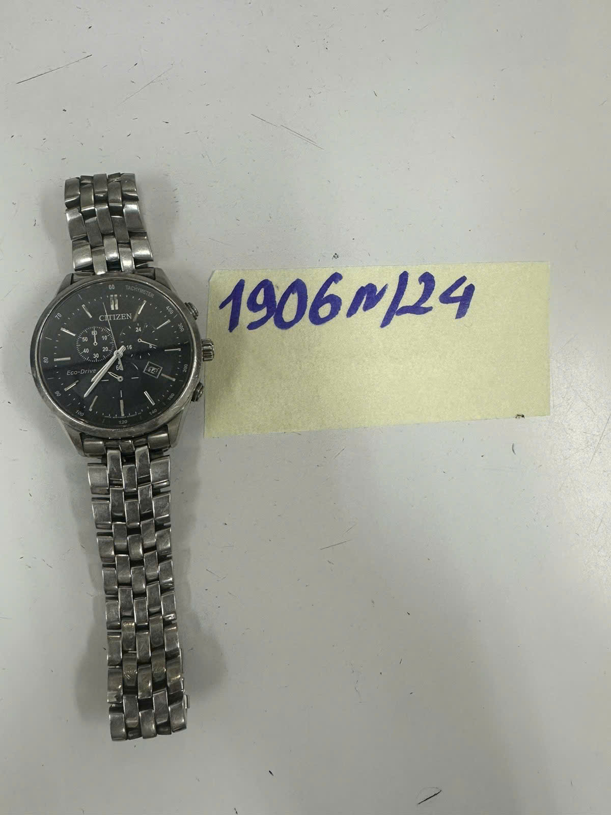 Ngày tiếp nhận: 07/11/2024 Mã hồ sơ: 1906N2024 Mô tả: 01 đồng hồ mặt hình tròn có chữ Citizen, dây đeo kim loại màu trắng. |