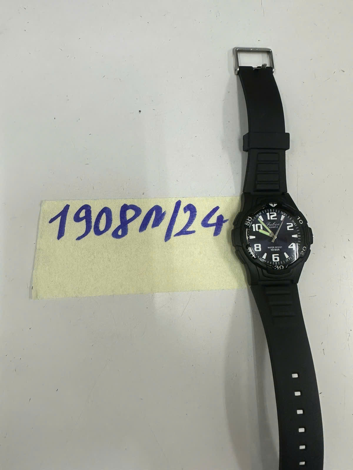 Ngày tiếp nhận: 07/11/2024 Mã hồ sơ: 1908N2024 Mô tả: 01 đồng hồ kim, mặt tròn màu đen, logo chữ "FALCON QUARTZ" dây nhựa màu đen. |