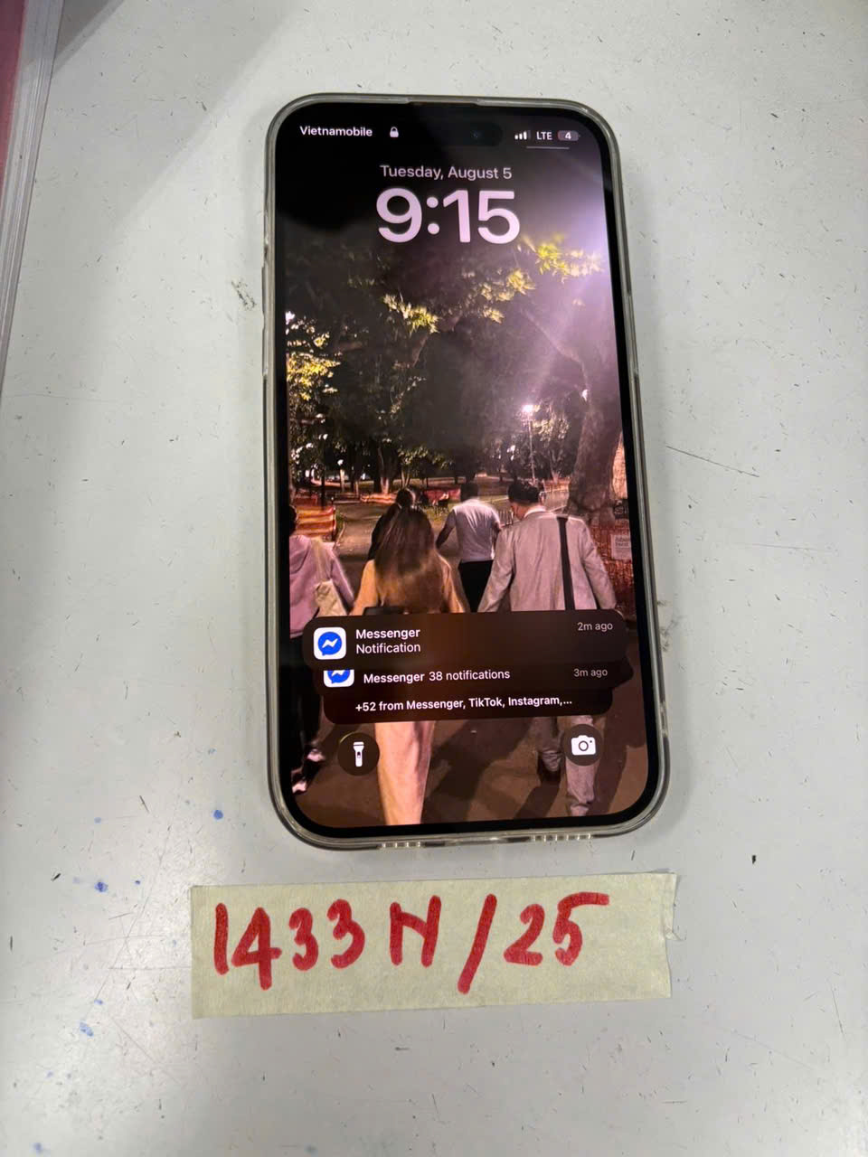 Ngày tiếp nhận: 05/8/2025 Mã hồ sơ: 1433N2025 Mô tả: 01 Điện thoại di động màu vàng có nhãn Apple đã sử dụng. |