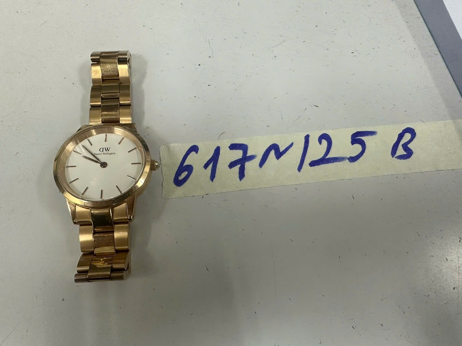 Ngày tiếp nhận: 06/4/2025 Mã hồ sơ: 617N2025B Mô tả: 01 đồng hồ mặt tròn chữ DW, dây kim loại màu vàng. |