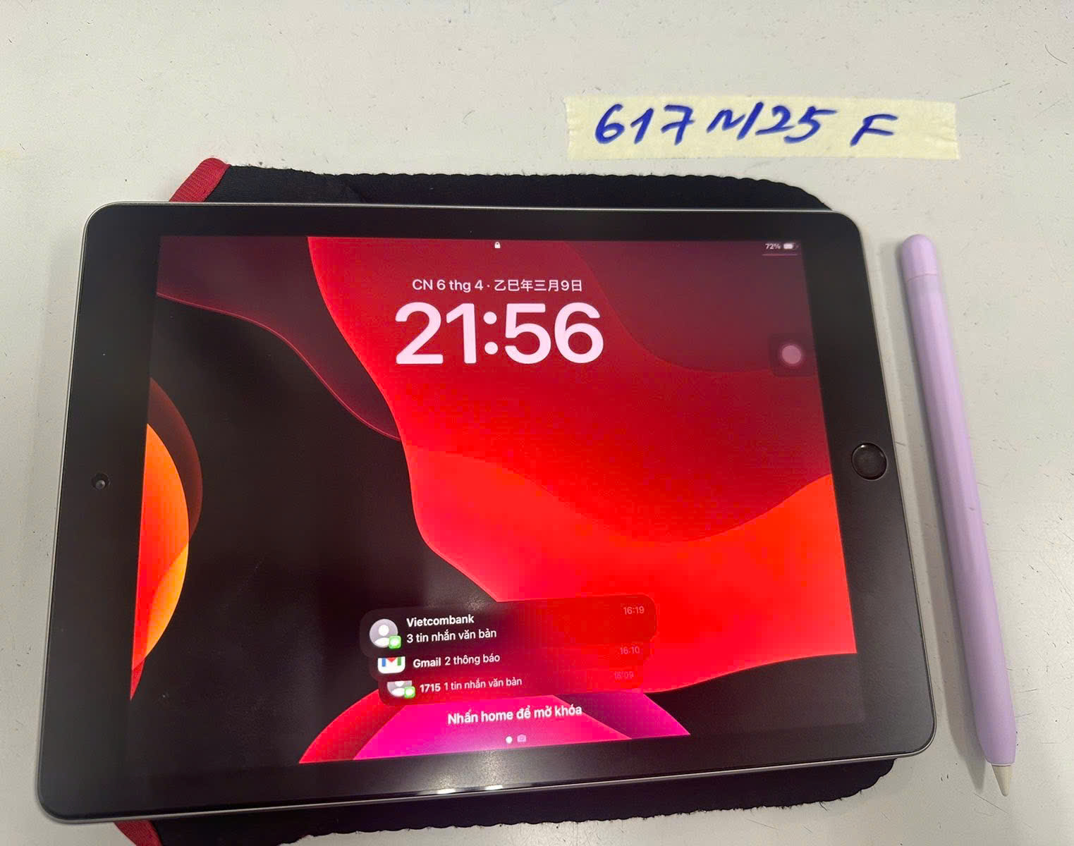 Ngày tiếp nhận: 06/4/2025 Mã hồ sơ: 617N2025F Mô tả: 01 Ipad màu xám, 01 bút màu tím bao vải màu đen. |
