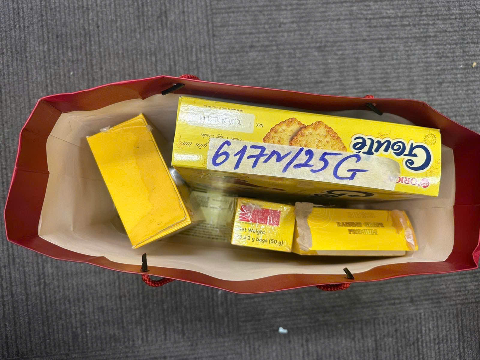 Ngày tiếp nhận: 06/4/2025 Mã hồ sơ: 617N2025G Mô tả: 01 túi giấy màu đỏ bên trong có: 01 hộp bánh AFC, 01 hộp bánh goute, 01 hộp trà lipton, 01 hộp cafe Costa (chưa qua sử dụng). |