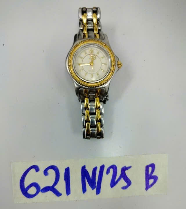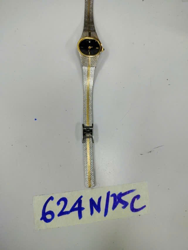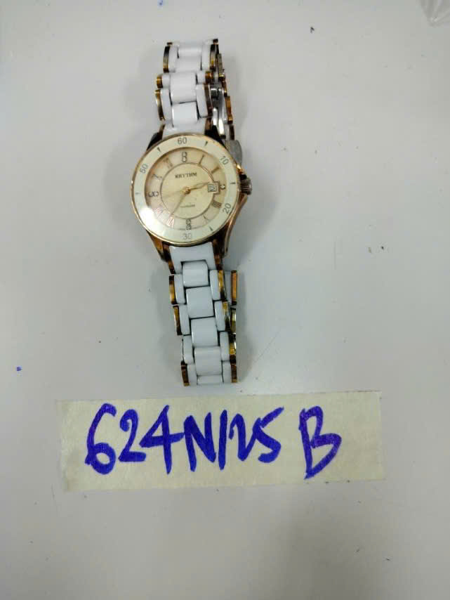 Ngày tiếp nhận: 07/4/2025 Mã hồ sơ: 624N2025B Mô tả: 01 đồng hồ đeo tay kim loại màu vàng, mặt đồng hồ hình tròn có logo “RHYTHM”. |