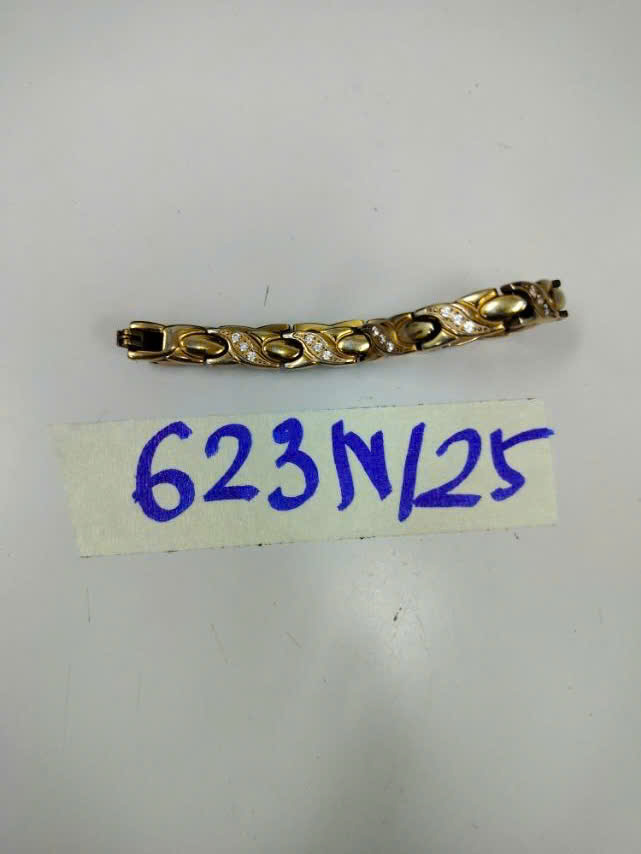 Ngày tiếp nhận: 07/4/2025 Mã hồ sơ: 623N2025 Mô tả: 01 vòng tay bằng kim loại màu vàng, có đính đá, không rõ hiệu. |