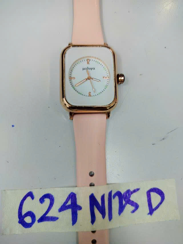 Ngày tiếp nhận: 07/4/2025 Mã hồ sơ: 624N2025D Mô tả: 01 đồng hồ đeo tay, mặt đồng hồ hình chữ nhật có logo “NOGIWA”, dây bằng nhựa màu hồng. |