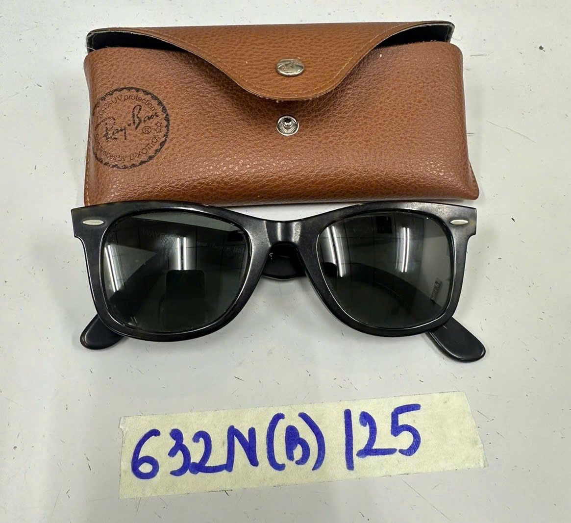 Ngày tiếp nhận: 07/4/2025 Mã hồ sơ: 632N2025B Mô tả: 01 mắt kính màu đen chữ Way-faver bao kính màu nâu chữ Rayban. |