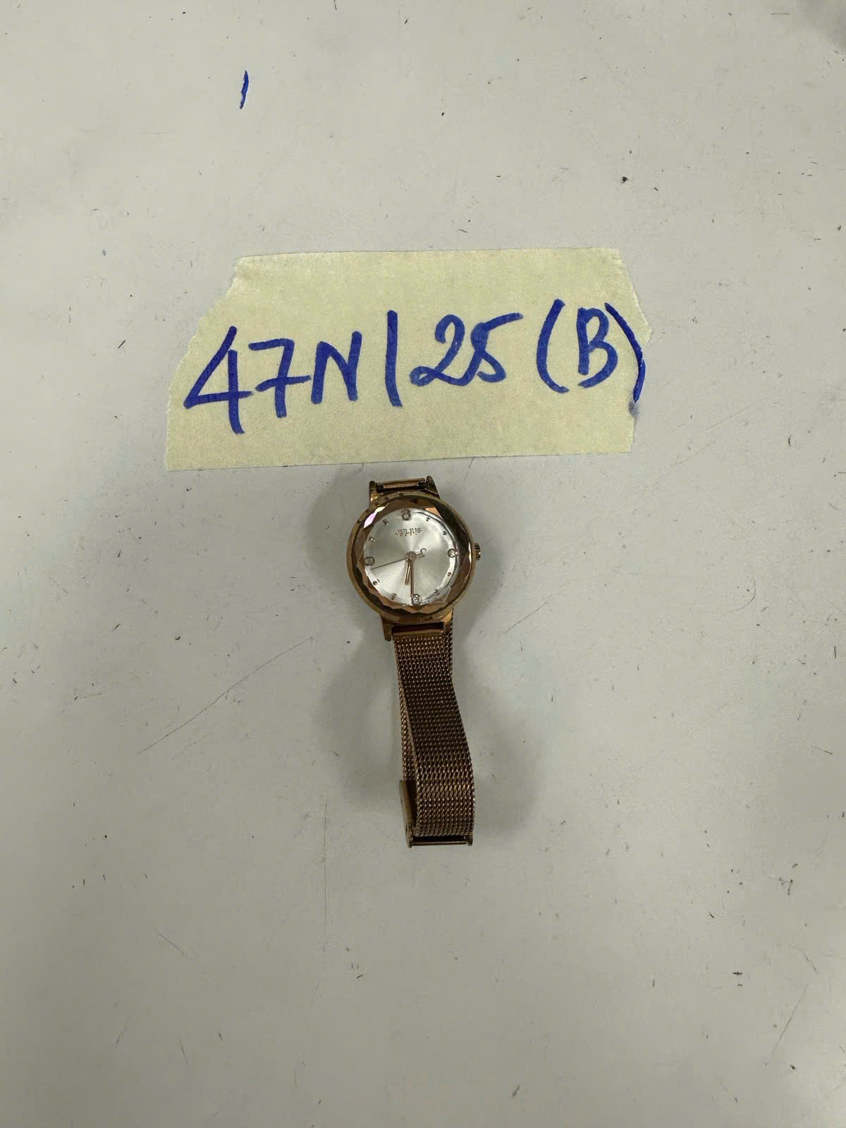 Ngày tiếp nhận: 08/01/2025 Mã hồ sơ: 54N2025B Mô tả: 01 đồng hồ dây kim loại màu vàng, mặt có chữ "Guess". |