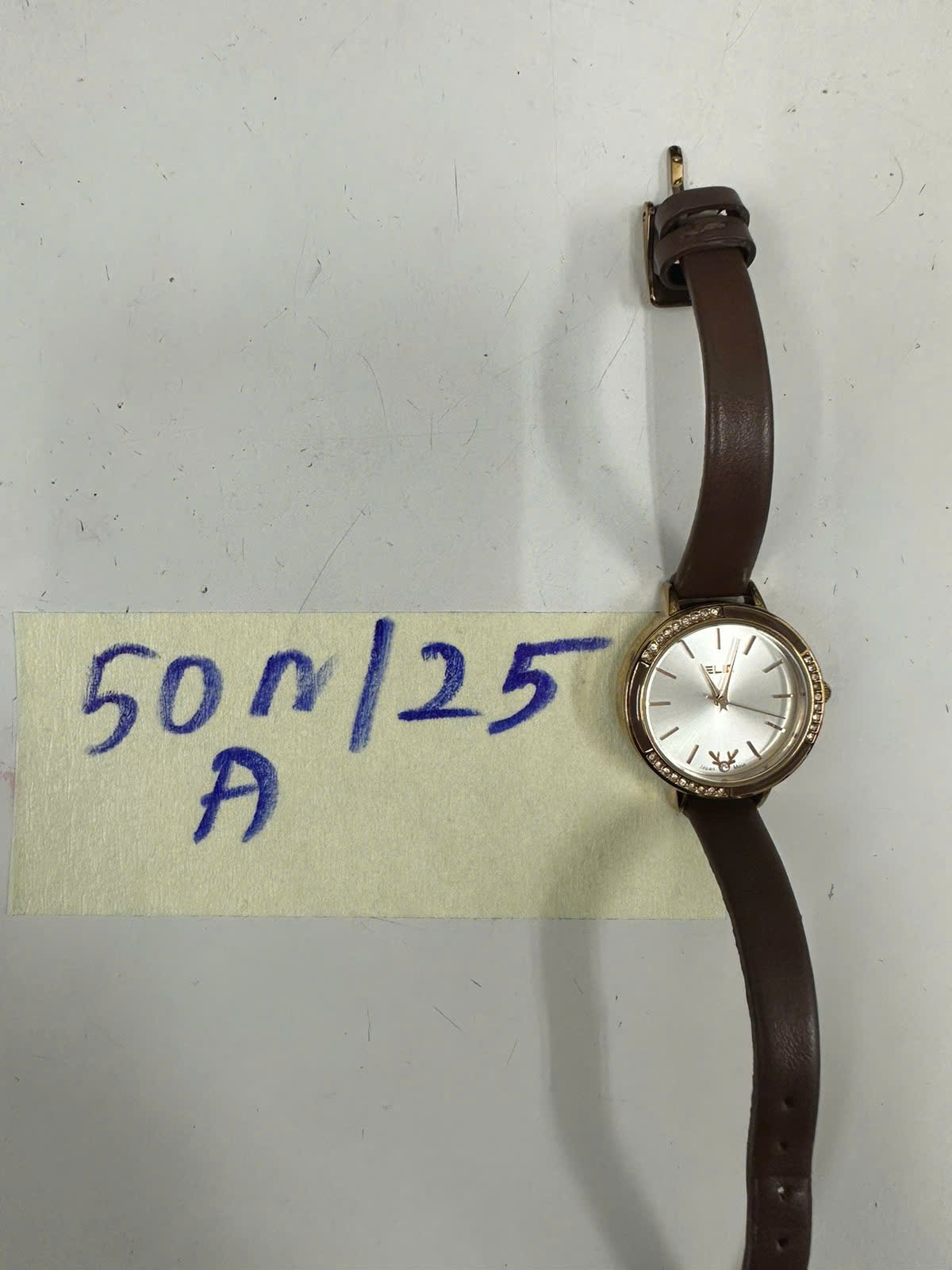 Ngày tiếp nhận: 07/01/2025 Mã hồ sơ: 50N2025A Mô tả: 01 đồng hồ mặt kim loại tròn "ELIO" dây da màu nâu. |