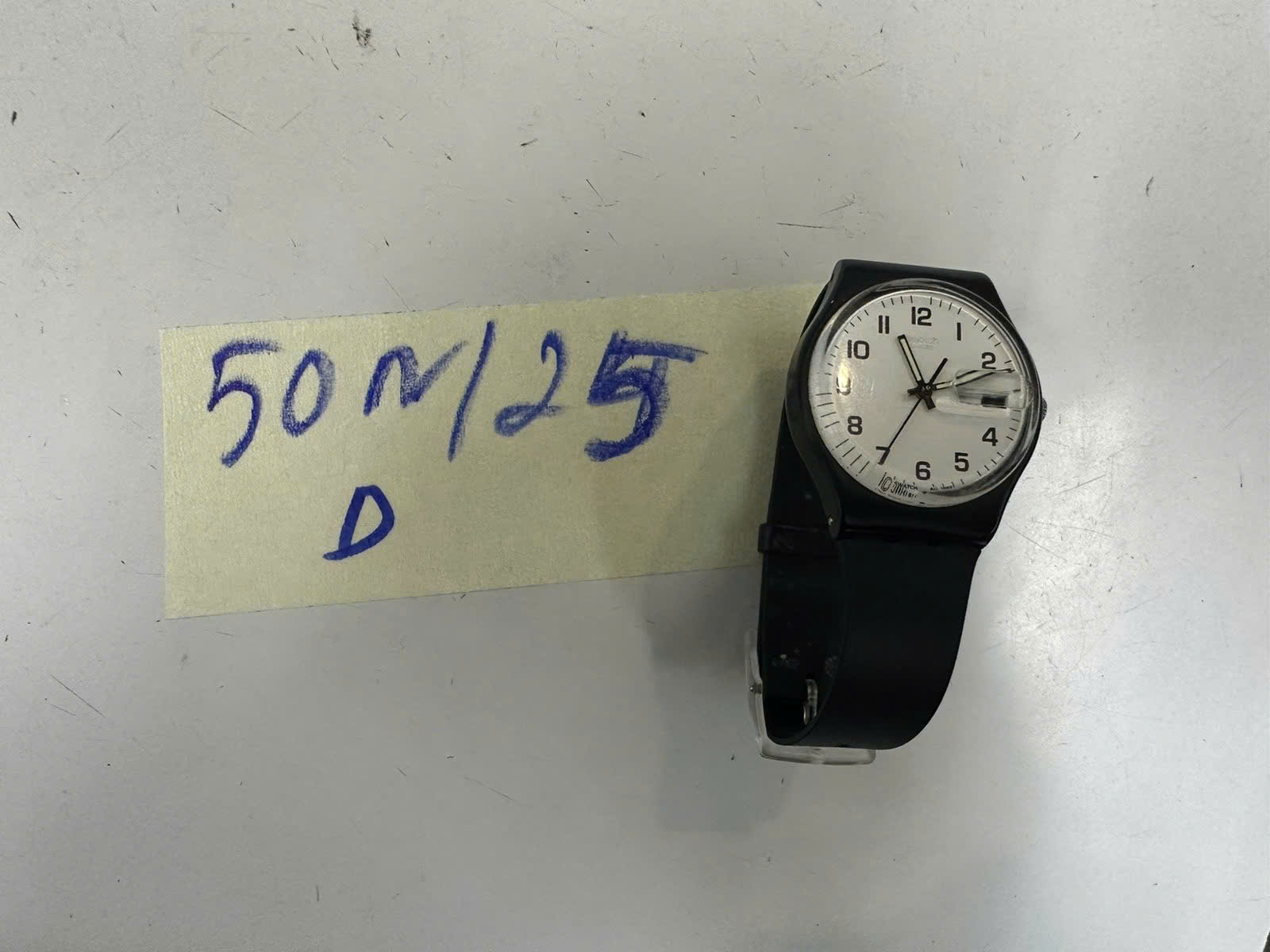 Ngày tiếp nhận: 07/01/2025 Mã hồ sơ: 50N2025D Mô tả: 01 đồng hồ kim loại mặt tròn màu trắng có chữ "SWATCH SWISS", dầy cao su màu đen. |