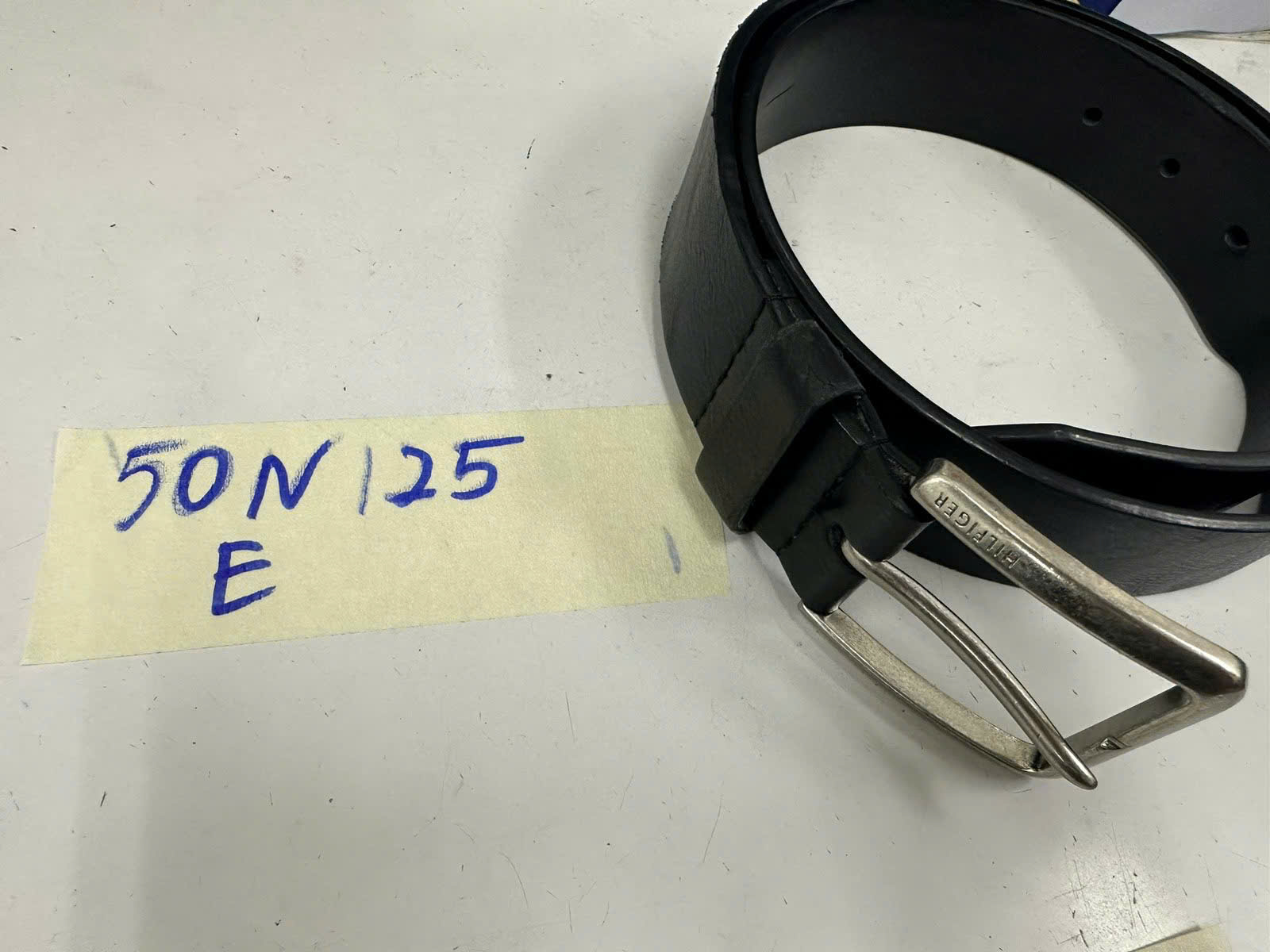 Ngày tiếp nhận: 07/01/2025 Mã hồ sơ: 50N2025E Mô tả: 01 thắt lưng da màu đen, khóa màu trắng có chữ "HILFIGER". |