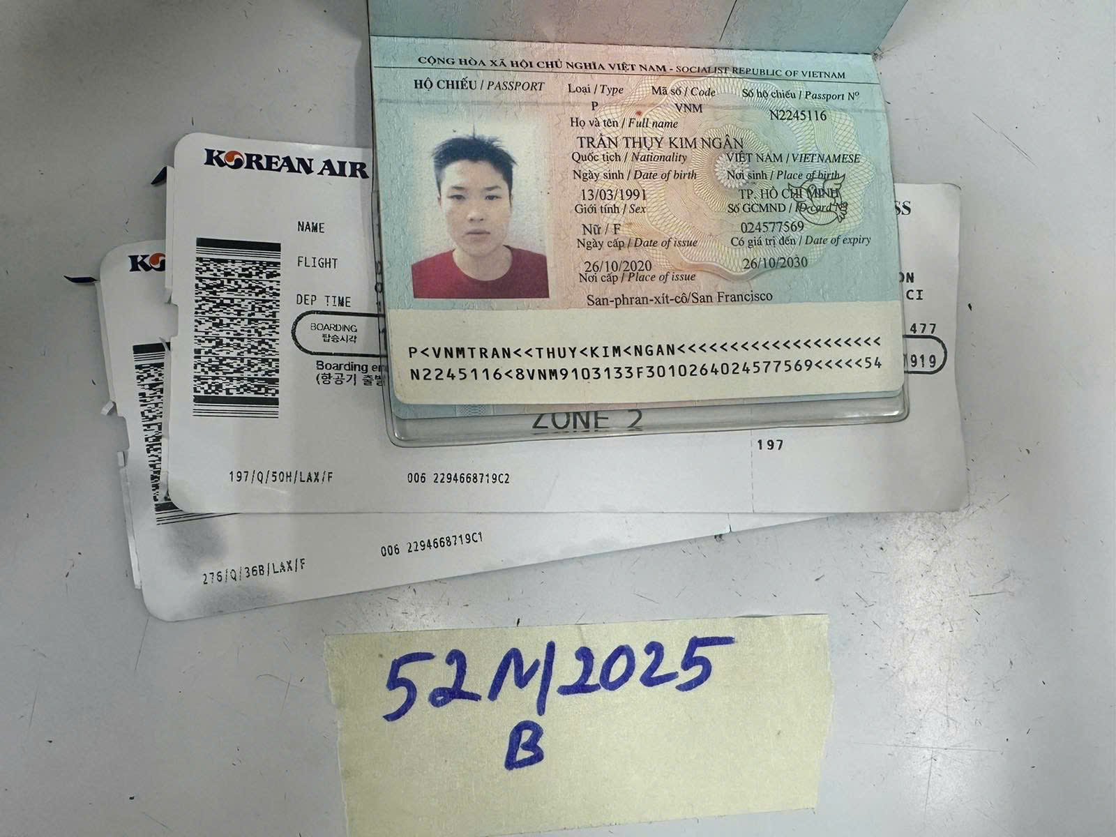 Ngày tiếp nhận: 08/01/2025 Mã hồ sơ: 52N2025B Mô tả: 01 hộ chiếu Việt Nam tên Trần Thụy Kim Ngân số: N2245116. |