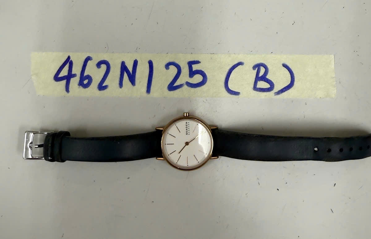 Ngày tiếp nhận: 09/03/2025 Mã hồ sơ: 462N2025B Mô tả: 01 đồng hồ màu trắng có chữ "Skagen" dây da màu xanh. |