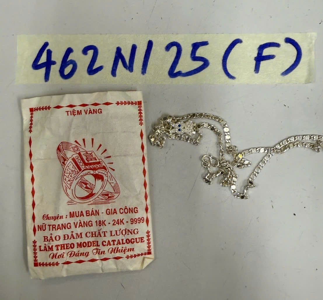 Ngày tiếp nhận: 09/03/2025 Mã hồ sơ: 462N2025F Mô tả: 01 túi giấy màu trắng có chữ Tiệm vàng bên trong có: dây chuyền kim loại có charm hình con thỏ. |