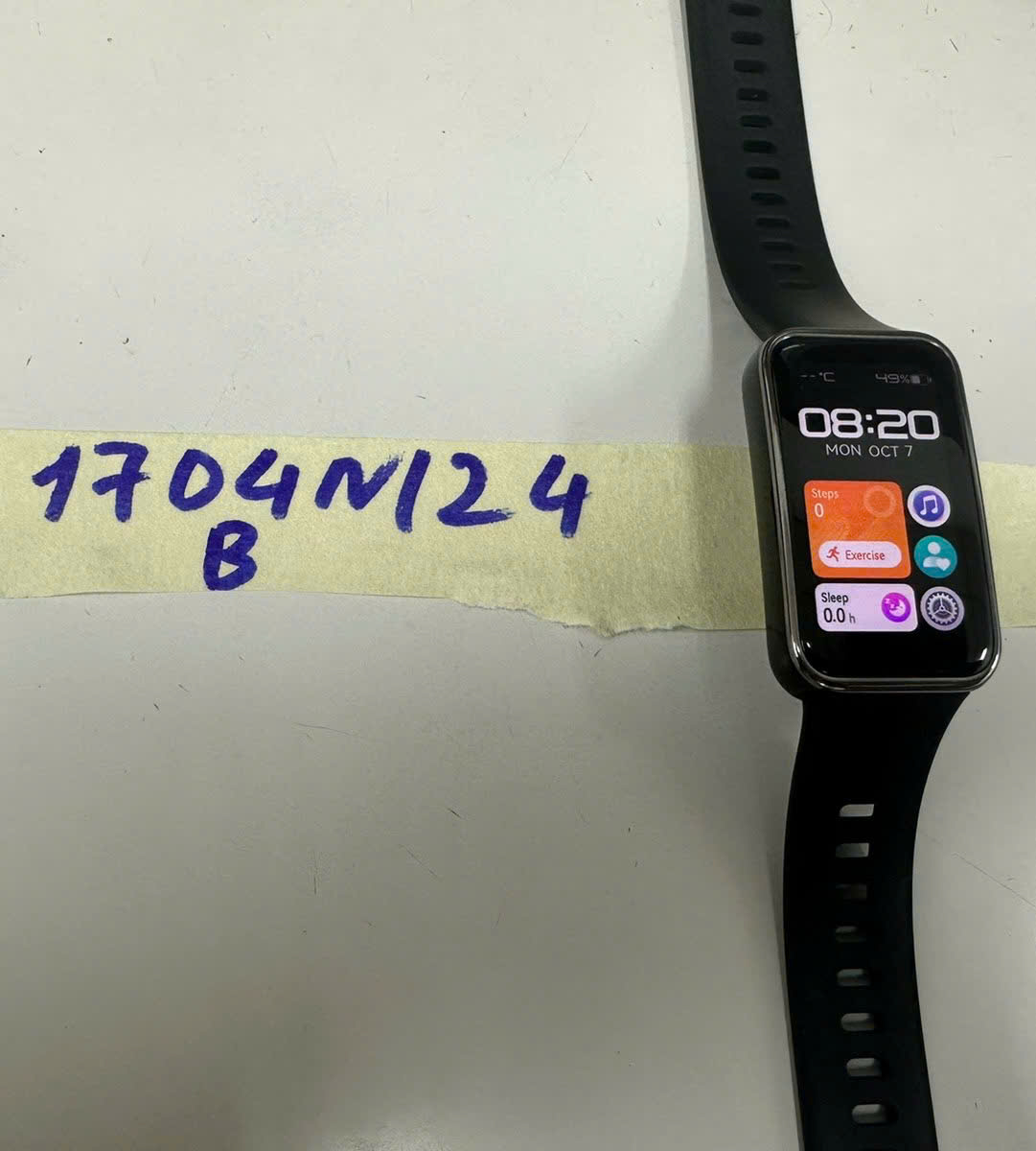Ngày tiếp nhận: 07/10/2024 Mã hồ sơ: 1704N2024B Mô tả: 01 đồng hồ thông minh dây cao su đen, mặt hình chữ nhật mặt sau chữ HUAWEI. |
