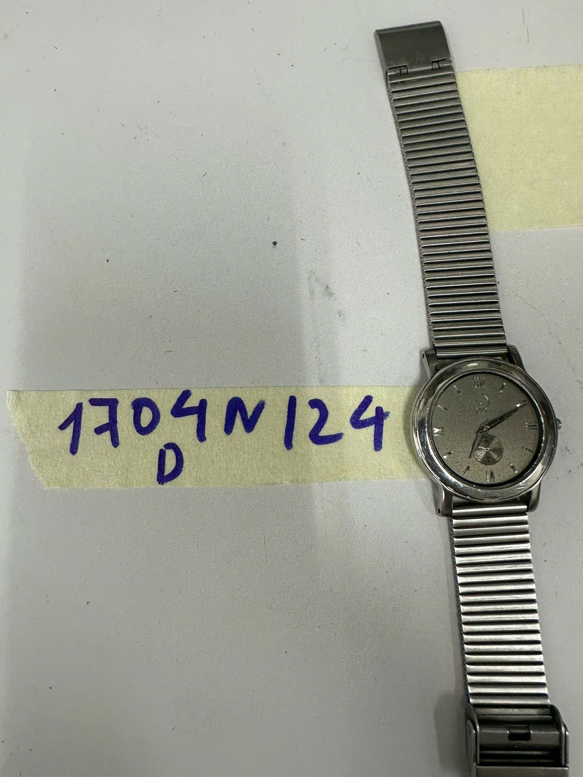Ngày tiếp nhận: 07/10/2024 Mã hồ sơ: 1704N2024D Mô tả: 01 đồng hồ mặt tròn có chữ LC dây kim loại màu trắng. |