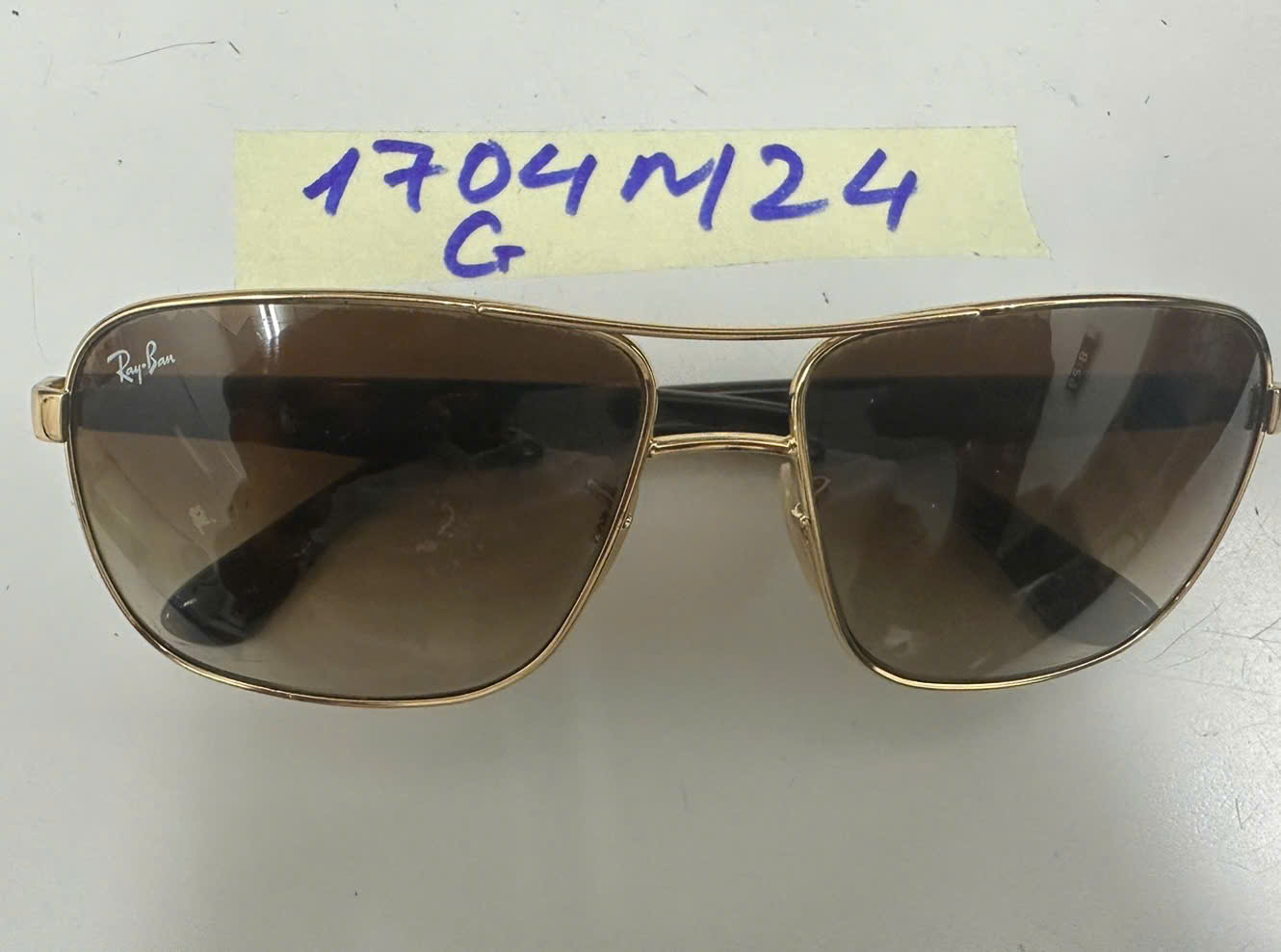 Ngày tiếp nhận: 07/10/2024 Mã hồ sơ: 1704N2024G Mô tả: 01 mắt kính gọng kim loại màu vàng, trên mặt chữ RAYBAN. |