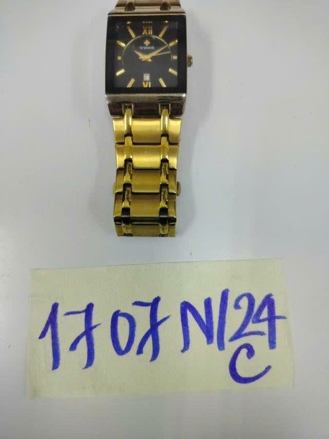 Ngày tiếp nhận: 07/10/2024 Mã hồ sơ: 1707N2024C Mô tả: 01 đồng hồ kim loại màu vàng chữ WWOOR. |