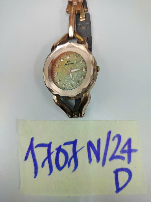 Ngày tiếp nhận: 07/10/2024 Mã hồ sơ: 1707N2024D Mô tả: 01 đồng hồ kim loại dây màu vàng nâu, mặt đồng hồ chữ BEE SISTER. |