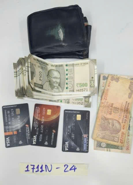 Ngày tiếp nhận: 08/10/2024 Mã hồ sơ: 1711N2024 Mô tả: 01 ví màu đen bên trong chứa: 58 tờ tiền mệnh giá 500 RUPEES, 01 tờ tiền mệnh giá 100 RUPEES, 02 tờ mệnh giá 10 RUPEES, một số giấy tờ tùy thân và 03 thẻ VISA tên PALADIA CHANDUBHAI V. |