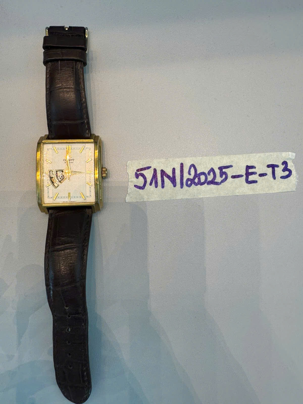 Ngày tiếp nhận: 07/10/2025 Mã hồ sơ: 51N2025E Mô tả: 01 đồng hồ mặt vuông viền kim loại màu vàng ORIENT. |