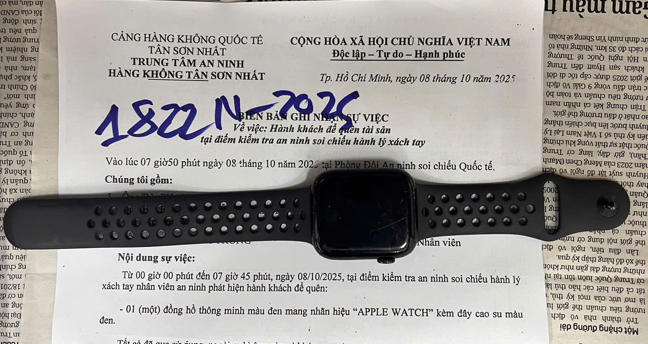 Ngày tiếp nhận: 08/10/2025 Mã hồ sơ: 1822N2025 Mô tả: 01 đồng hồ thông minh màu đen APPLE WATCH kèm dây cao su màu đen. |