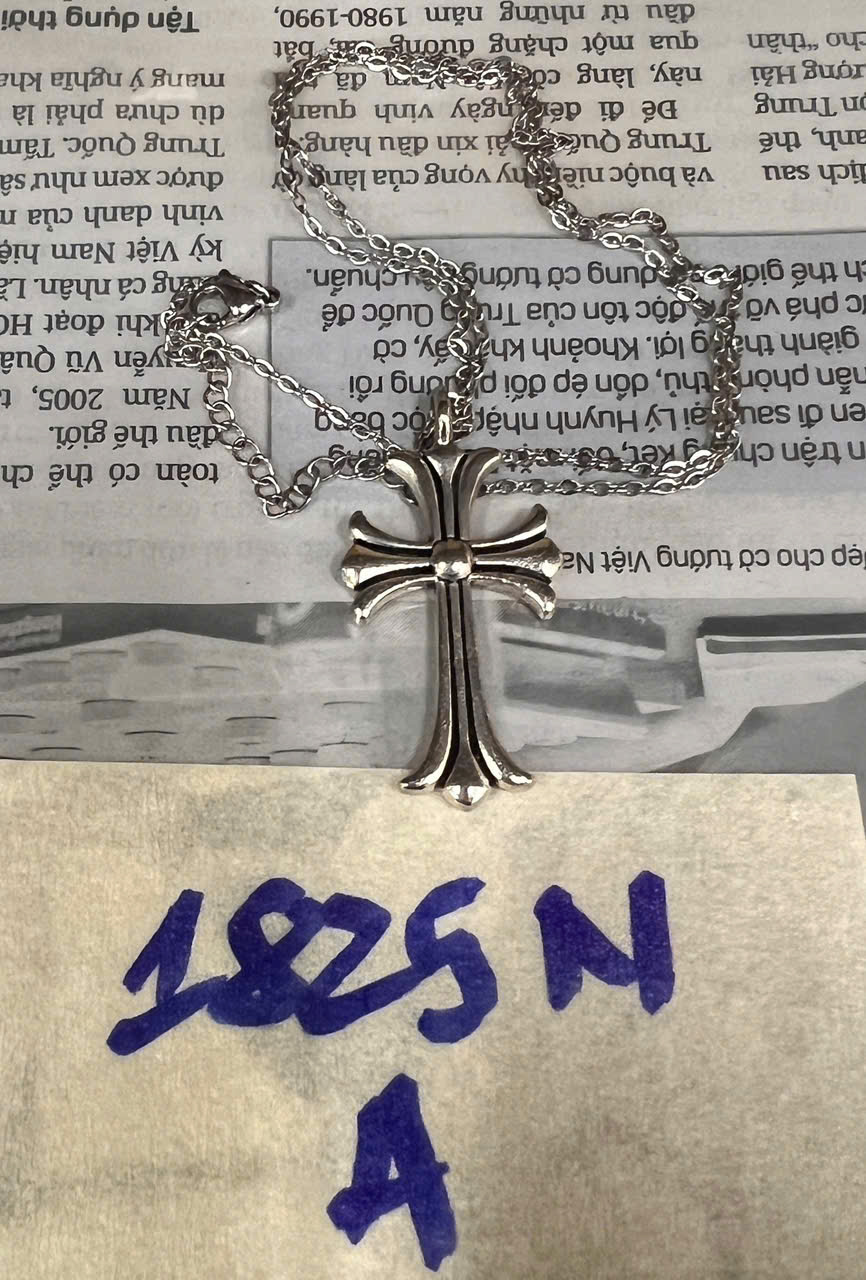 Ngày tiếp nhận: 08/10/2025 Mã hồ sơ: 1825N2025A Mô tả: 01 dây chuyền kim loại màu bạc, mặt thánh giá kim loại màu bạc. |