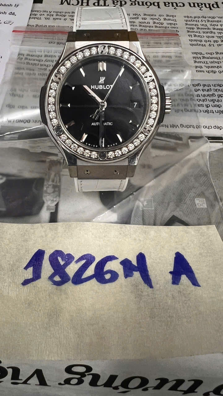 Ngày tiếp nhận: 08/10/2025 Mã hồ sơ: 1826N2025A Mô tả: 01 đồng hồ mặt hình tròn bằng kim loại màu bạc có chữ HUBLOT, dây da màu trắng. |