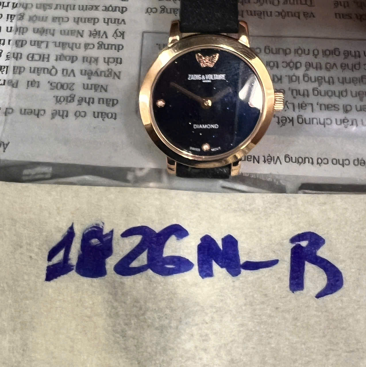 Ngày tiếp nhận: 08/10/2025 Mã hồ sơ: 1826N2025B Mô tả: 01 đồng hồ mặt hình tròn bằng kim loại màu vàng đồng có chữ ZADIG & VOLTAIRE, dây da màu đen. |
