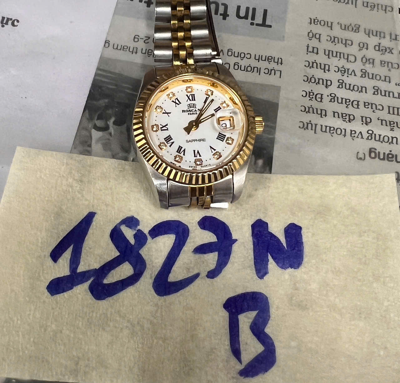 Ngày tiếp nhận: 08/10/2025 Mã hồ sơ: 1827N2025B Mô tả: 01 đồng hồ kim loại mặt tròn ROSCANI, dây kim loại màu vàng đồng viền bạc. |