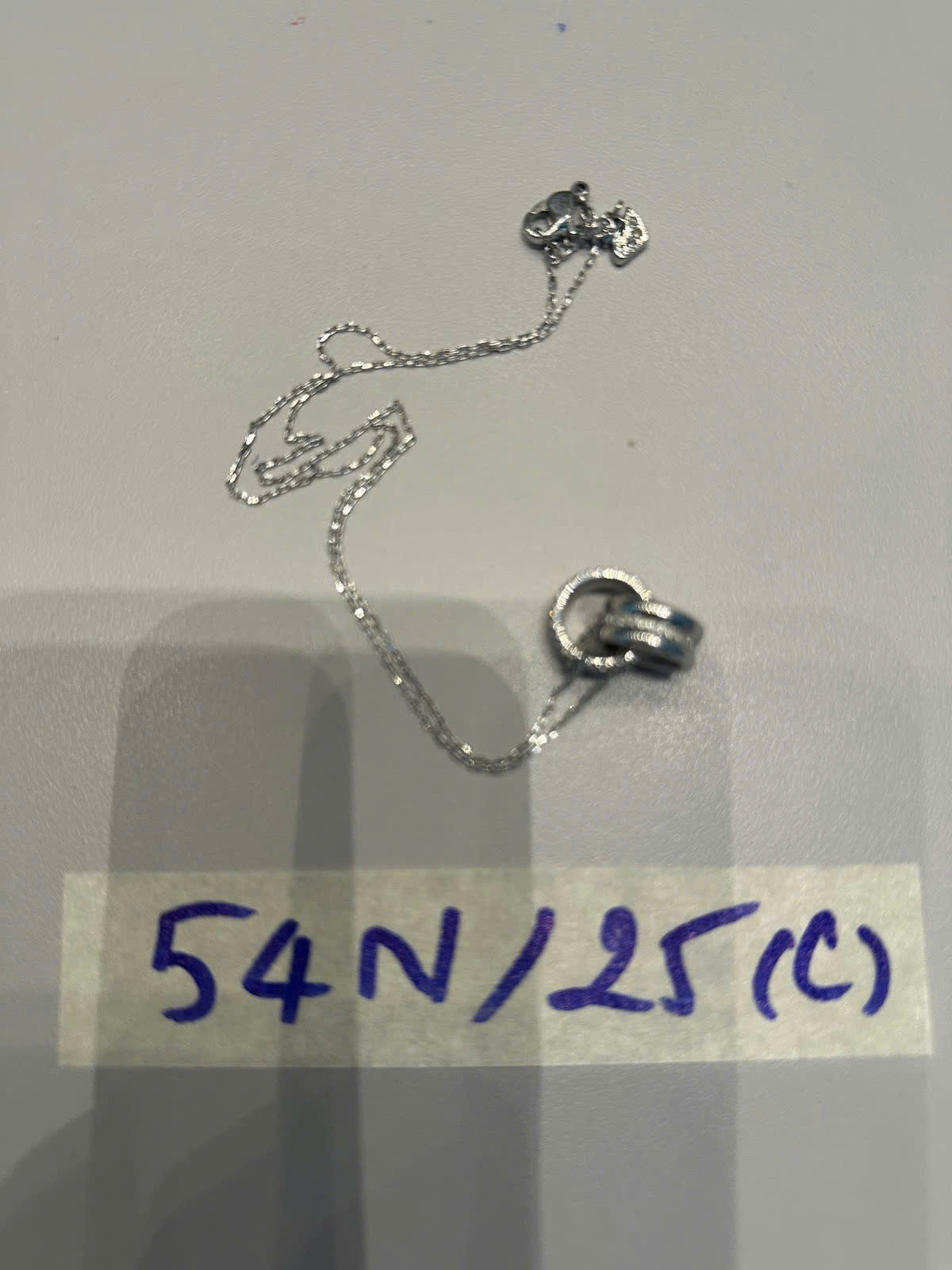 Ngày tiếp nhận: 09/10/2025 Mã hồ sơ: 54N2025C Mô tả: 01 dây chuyền kl màu trắng mặt hình tròn giống nhẫn. |