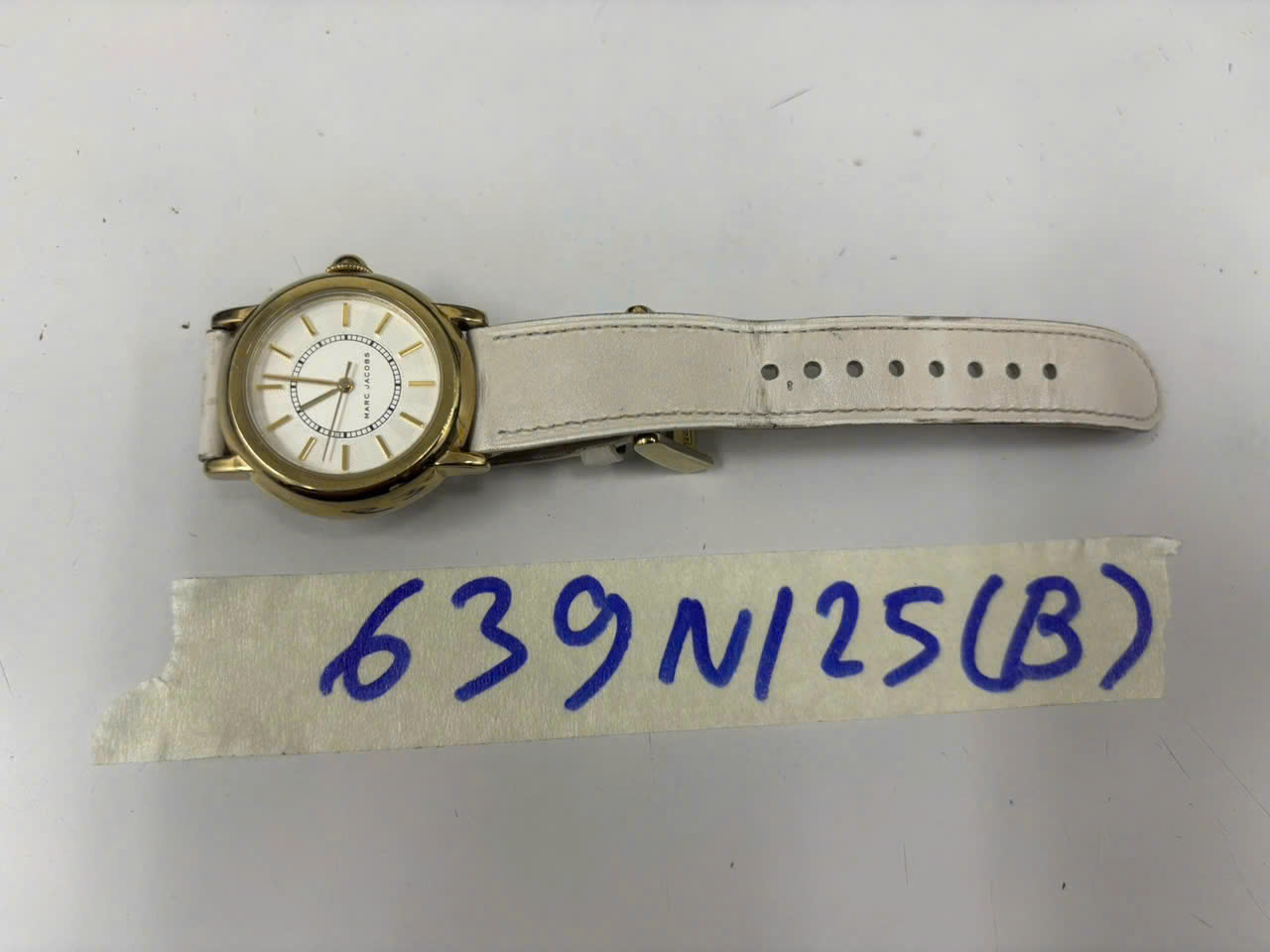 Ngày tiếp nhận: 08/4/2025 Mã hồ sơ: 639N2025B Mô tả: 01 đồng hồ đeo tay nữ dây da, màu vàng, mặt tròn có chữ MARC JACOBS. |