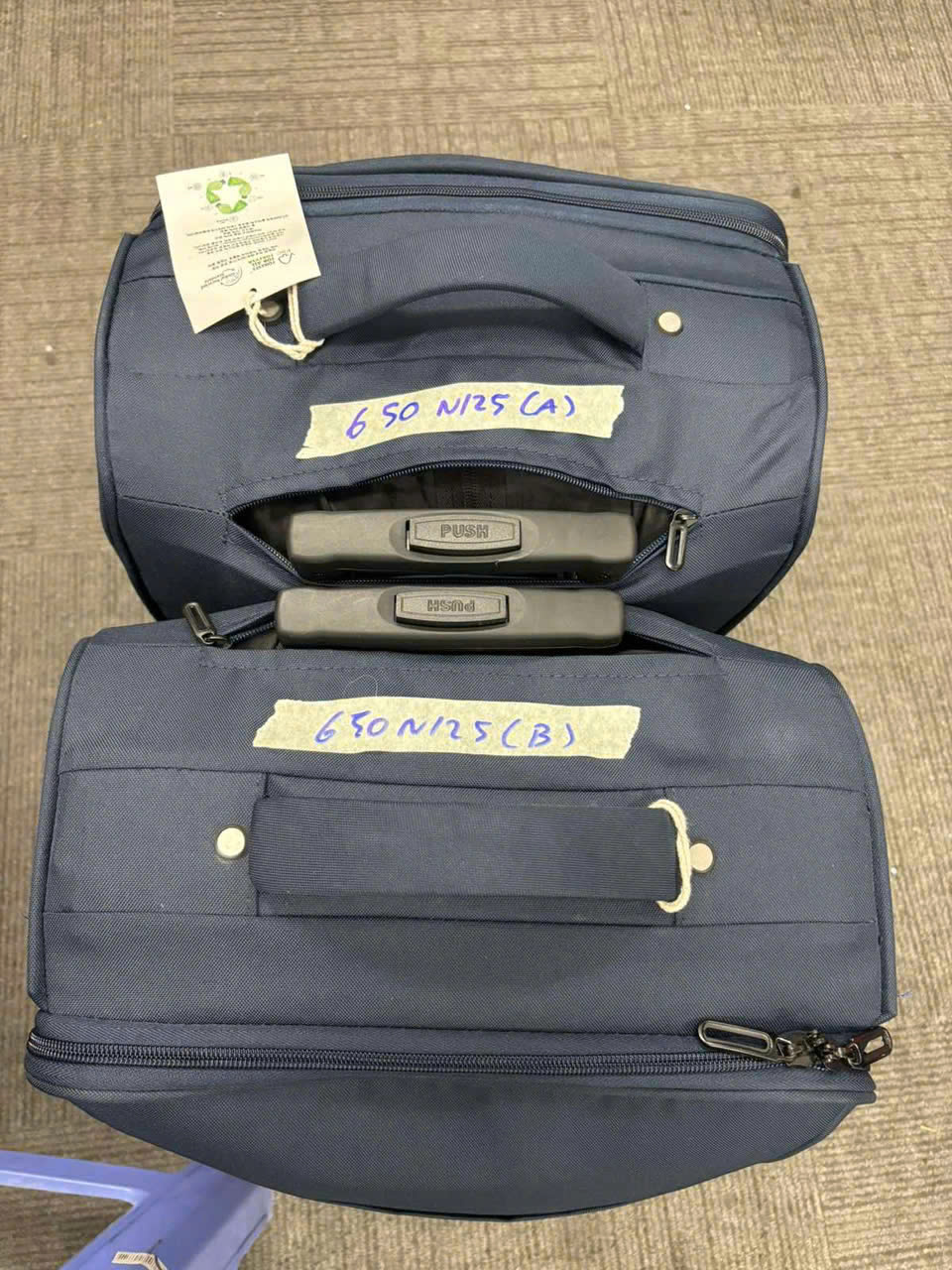 Ngày tiếp nhận: 09/4/2025 Mã hồ sơ: 650N2025 Mô tả: 02 valy vải màu xanh bên trong có thực phẩm. |