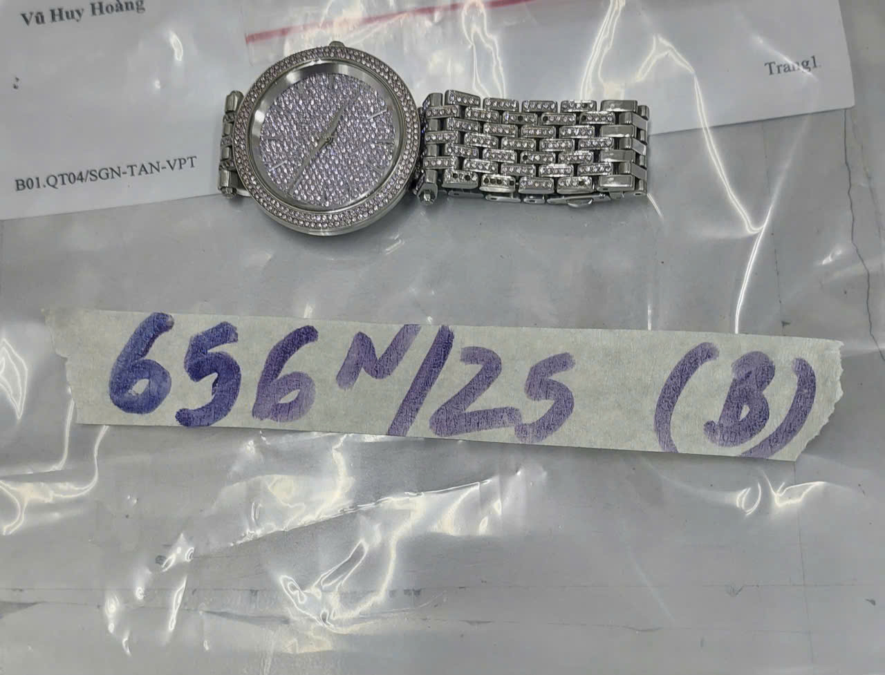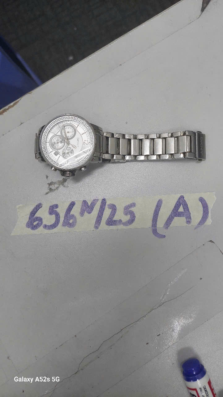 Ngày tiếp nhận: 10/4/2025 Mã hồ sơ: 656N2025B Mô tả: 01 đồng hồ đeo tay kim loại màu trắng "micheal KORS". |