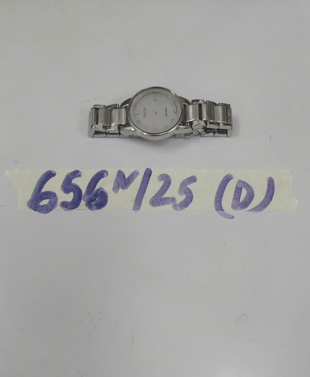 Ngày tiếp nhận: 10/4/2025 Mã hồ sơ: 656N2025D Mô tả: 01 đồng hồ đeo tay kim loại màu trắng chữ "citizen. |