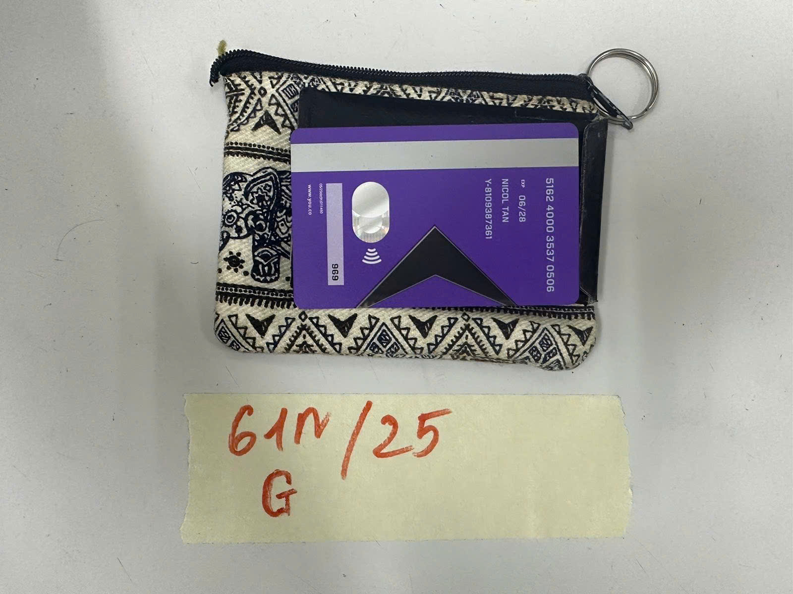 Ngày tiếp nhận: 10/01/2025 Mã hồ sơ: 61N2025G Mô tả: 01 Ví màu trắng có họa tiết hình con voi bên trong chứa: 01 thẻ màu tím có tên NICOL TAN. |