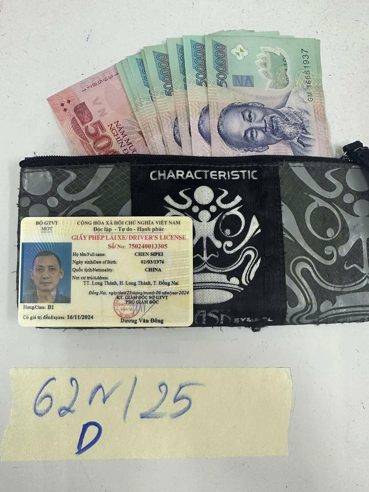 Ngày tiếp nhận: 10/01/2025 Mã hồ sơ: 62N2025D Mô tả: 01 Ví có chữ CHARACTERISTIC bên trong có: một số tờ tiền với tổng mệnh giá 5.050.000 vnđ; 01 thẻ Apec, 01 GPLX cùng mang tên CHEN SIPEI. |