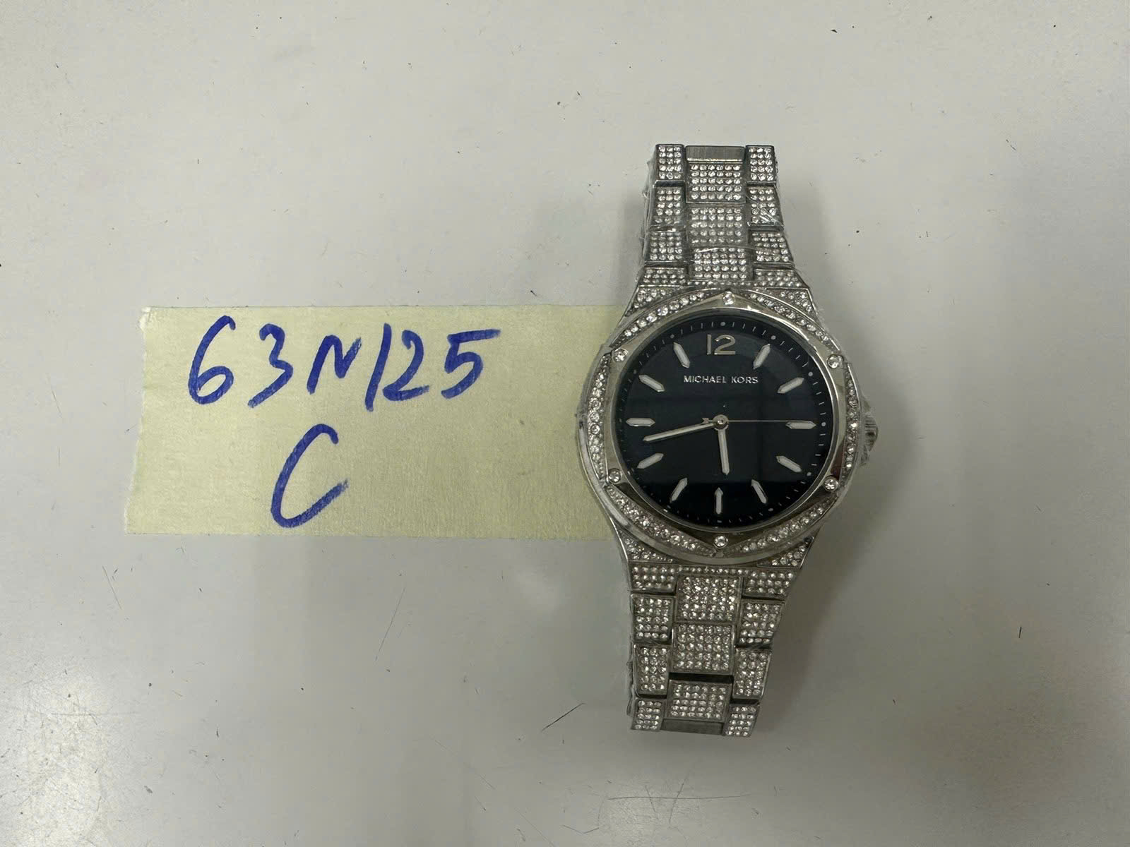 Ngày tiếp nhận: 10/01/2025 Mã hồ sơ: 63N2025C Mô tả: 01 mặt hình tròn có chữ Michael Kors, viền đính đá màu trắng, đây đeo kim loại màu trắng. |
