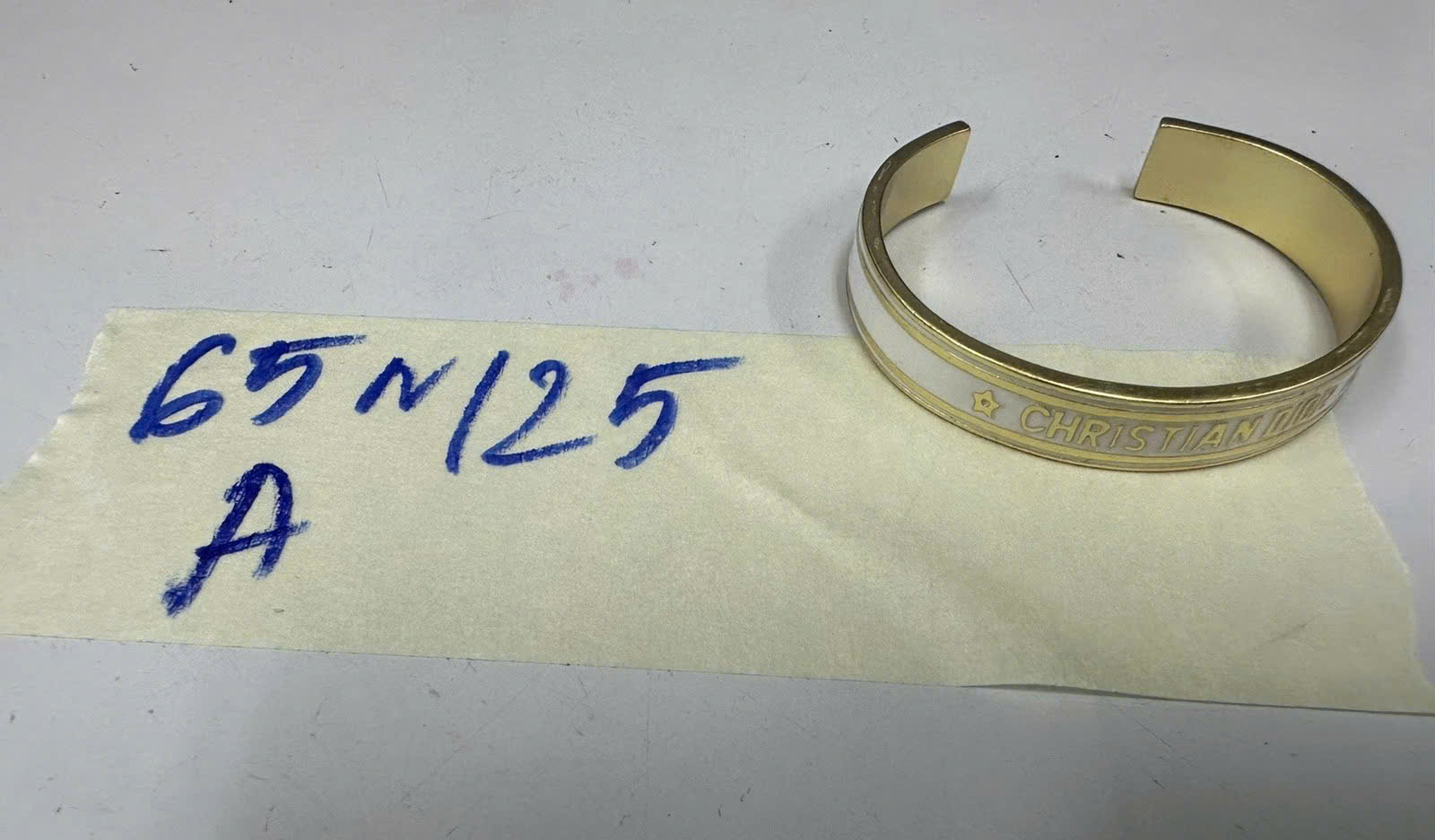 Ngày tiếp nhận: 10/01/2025 Mã hồ sơ: 65N2025A Mô tả: 01 Vòng tay kim loại có màu vàng và trắng, trên vòng tay có chữ CHRIS TIAN DIOR. |