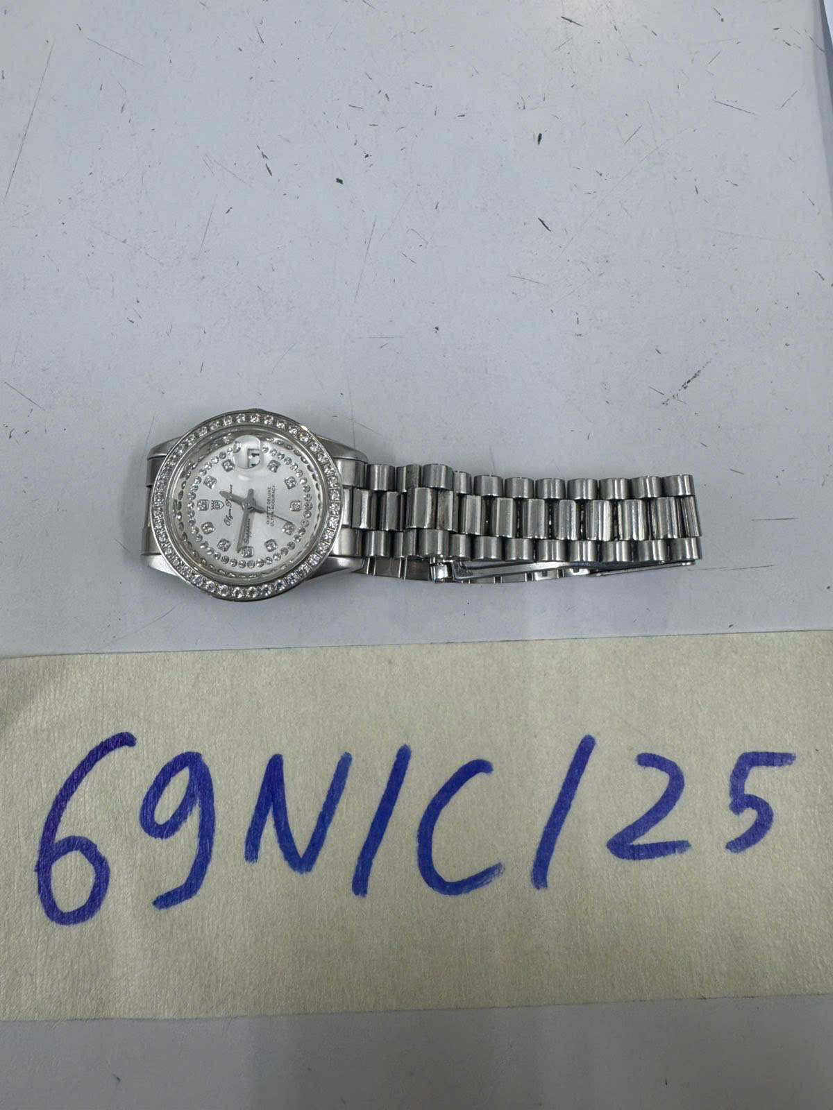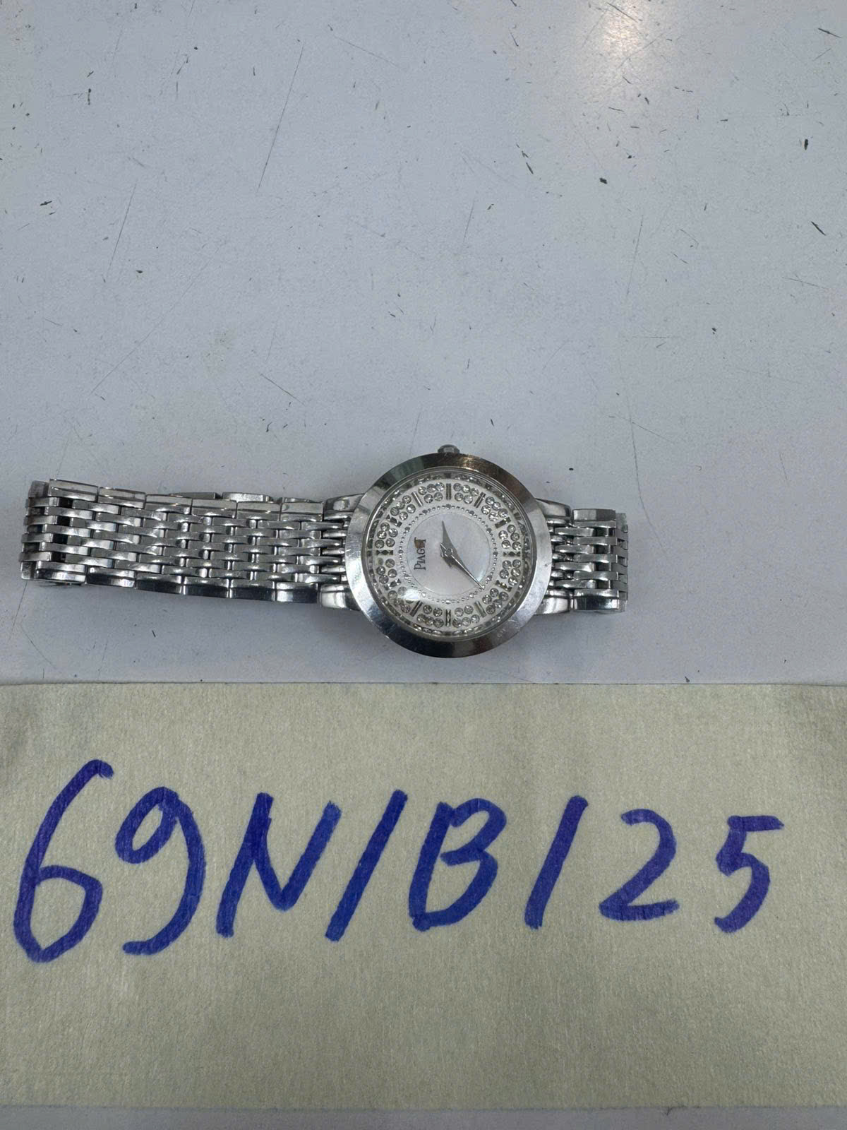 Ngày tiếp nhận: 10/01/2025 Mã hồ sơ: 69N2025B Mô tả: 01 Đồng hồ dây kim loại màu trắng có chữ" Piage T". |
