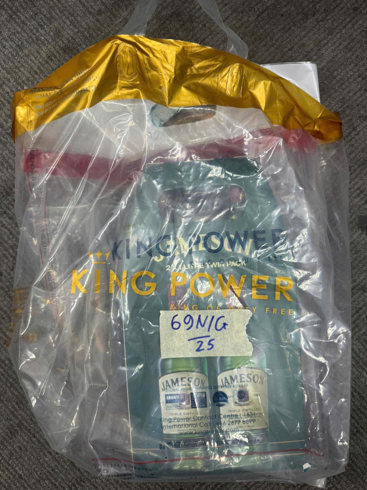 Ngày tiếp nhận: 10/01/2025 Mã hồ sơ: 69N2025G Mô tả: 02 chai rượu trong bịch nilon có chữ " JAMESON". |