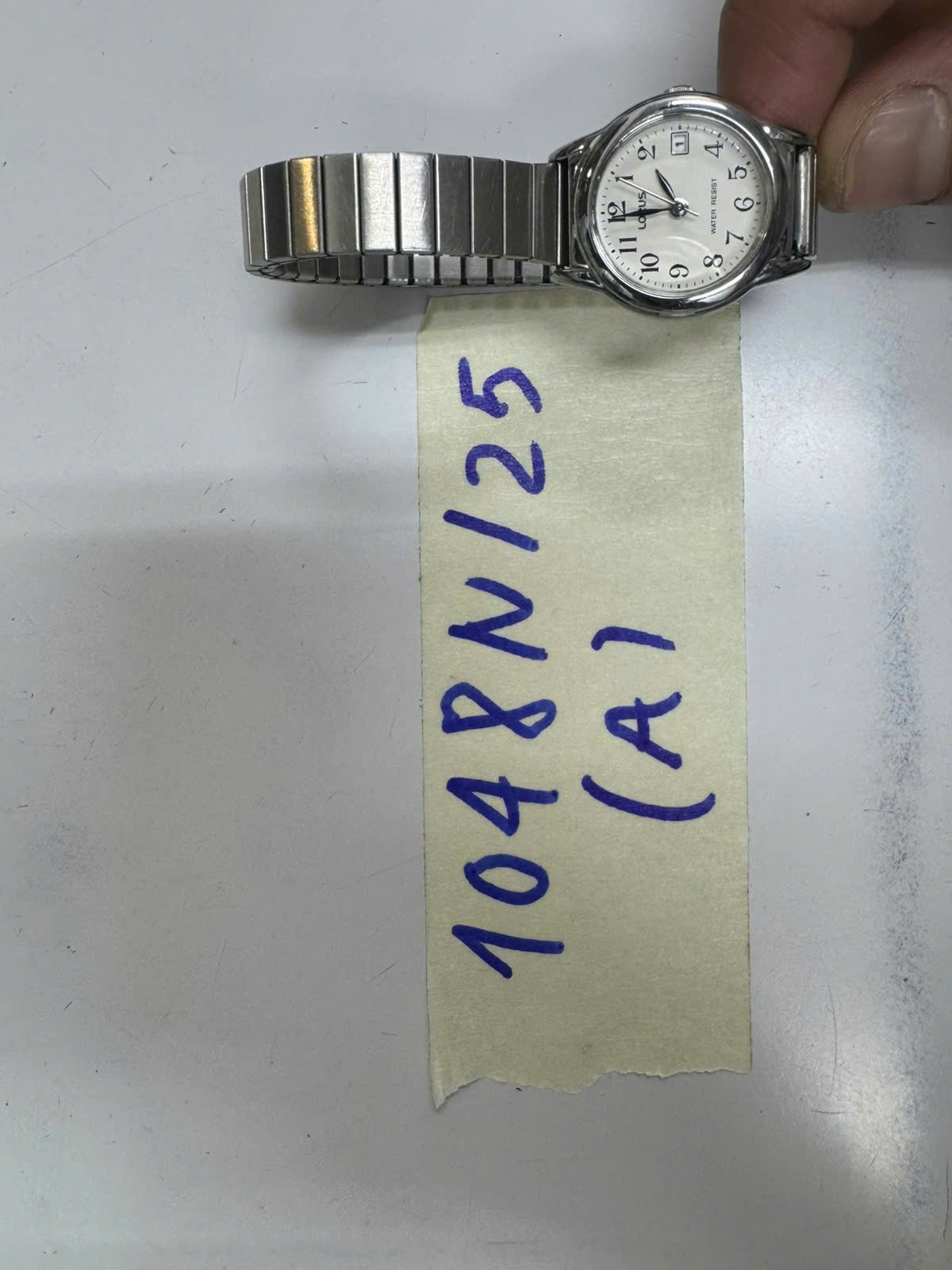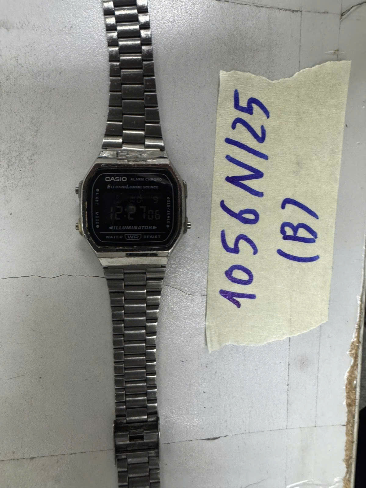 Ngày tiếp nhận: 09/6/2025 Mã hồ sơ: 1056N2025B Mô tả: 01 đồng hồ Casio mặt vuông màu bạc, dây đeo kim loại màu bạc. |