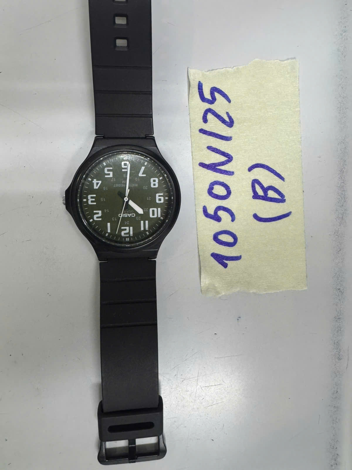 Ngày tiếp nhận: 09/6/2025 Mã hồ sơ: 1050N2025B Mô tả: 01 đồng hồ Casio mặt tròn dây nhựa màu đen. |