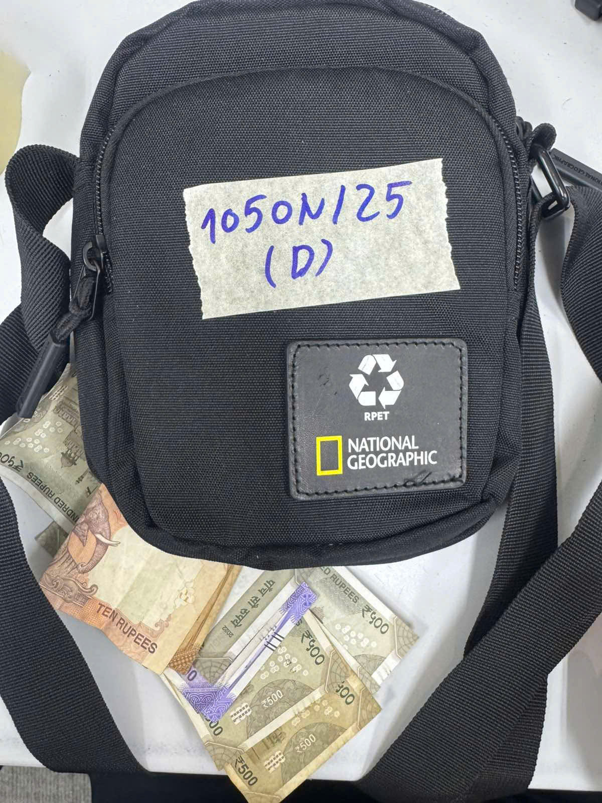 Ngày tiếp nhận: 09/6/2025 Mã hồ sơ: 1050N2025D Mô tả: 01 túi đeo màu đen có in dòng chữ Rpet bên trong có một: hộp tai nghe màu đen đầy dủ tai nghe, năm tờ 500 rupees, 2 tờ 100 rupees, 1 tờ 20 rupees. |