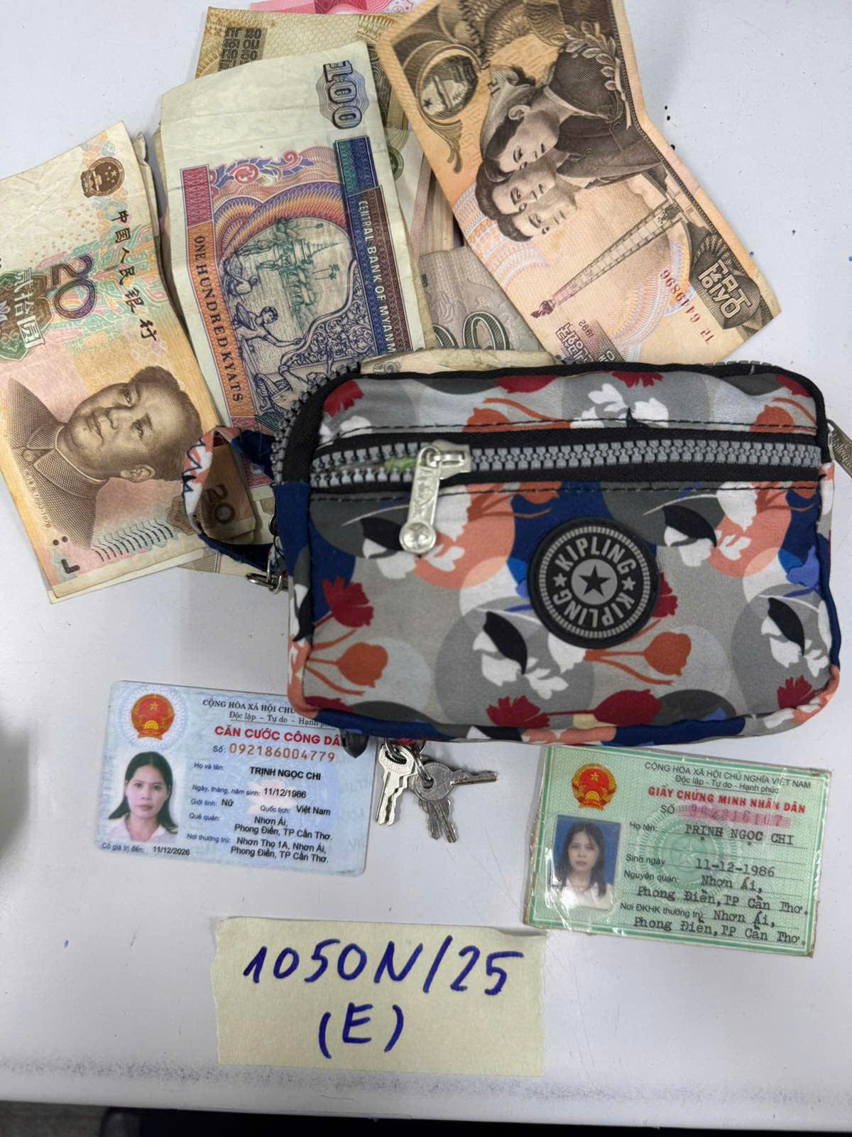 Ngày tiếp nhận: 09/6/2025 Mã hồ sơ: 1050N2025E Mô tả: 01 túi đựng tiền có in logo chữ Kipling bên trong gồm: 01 thẻ CCCD tên Trịnh Ngọc Chi, 01 thẻ CMND tên Trịnh Ngọc Chi, 01 hộp ngựa hình trái tim đựng nữ trang và tiền giấy các loại: 10 đô la Mỹ, 239000 nghìn vnđ, 1500 piso, 31 đồng Yuan, 150 đồng myamar, 6 đô la sing, 5130 đồng tiền giấy không quốc gia. Tất cả đã qua sử dụng. |