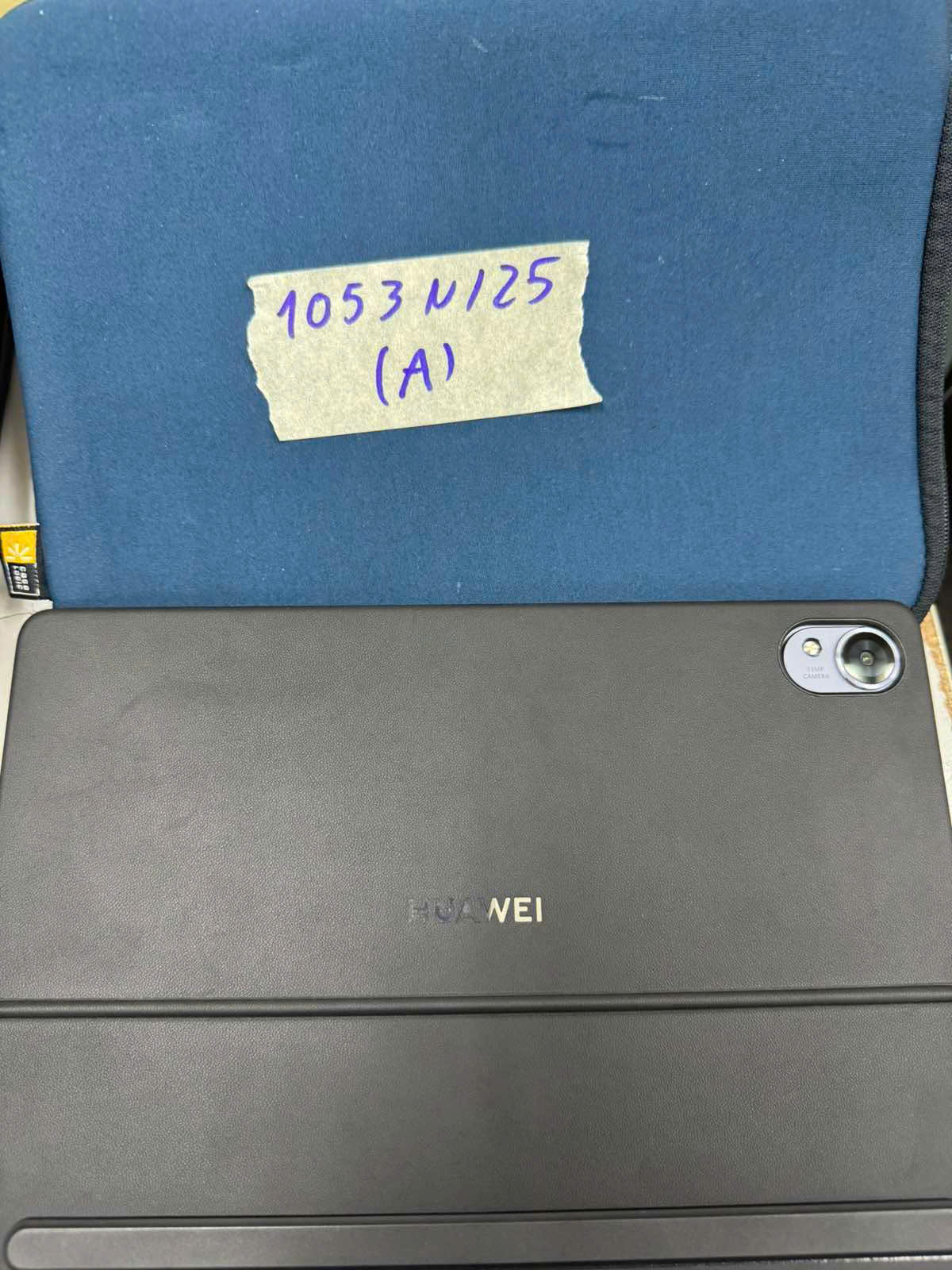 Ngày tiếp nhận: 09/6/2025 Mã hồ sơ: 1053N2025A Mô tả: 01 túi đựng màu xanh dương chứa: 01 máy tính bảng có logo chữ Huawei màu xám, cùng ốp lưng bàn phím màu đen bằng nhựa. |